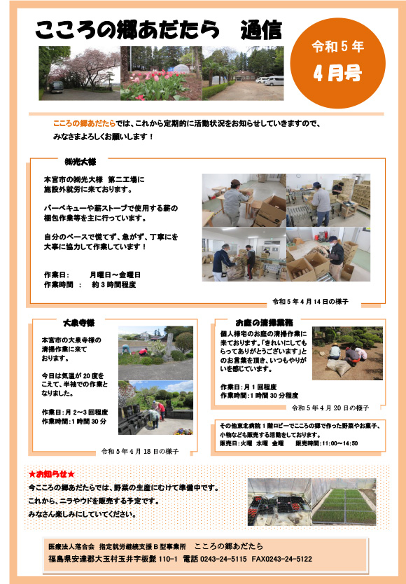 当法人が運営する「指定就労継続支援B型事業所 こころの郷あだたら」の活動状況をお知らせします。内容についてお問い合わせ等がありましたら担当者までご連絡ください。