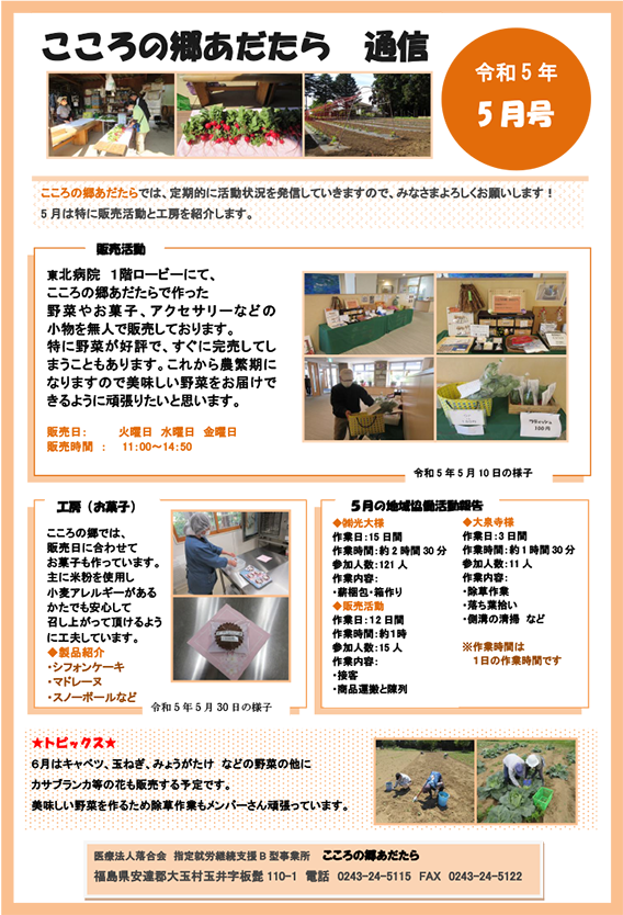 当法人が運営する「指定就労継続支援B型事業所 こころの郷あだたら」の5月活動状況をお知らせします。内容についてお問い合わせ等がありましたら担当者までご連絡ください。