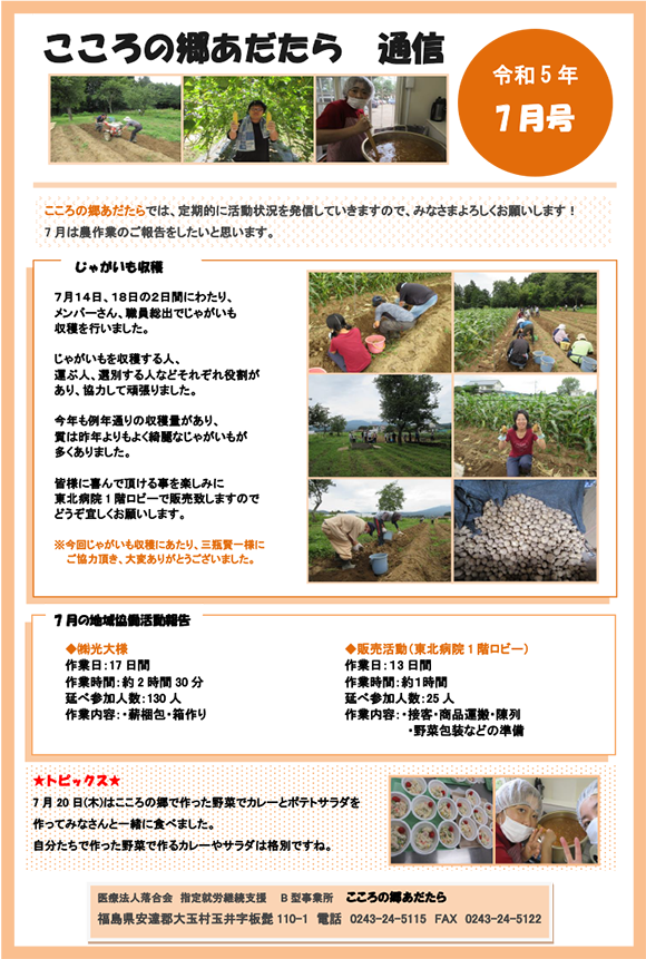 当法人が運営する「指定就労継続支援B型事業所 こころの郷あだたら」の7月活動状況をお知らせします。内容についてお問い合わせ等がありましたら担当者までご連絡ください。