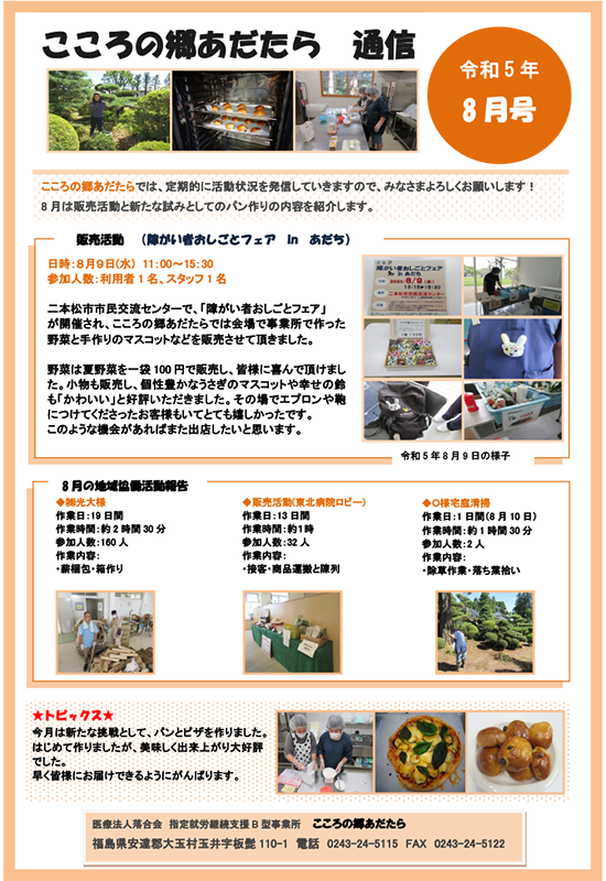 当法人が運営する「指定就労継続支援B型事業所 こころの郷あだたら」の8月活動状況をお知らせします。内容についてお問い合わせ等がありましたら担当者までご連絡ください。