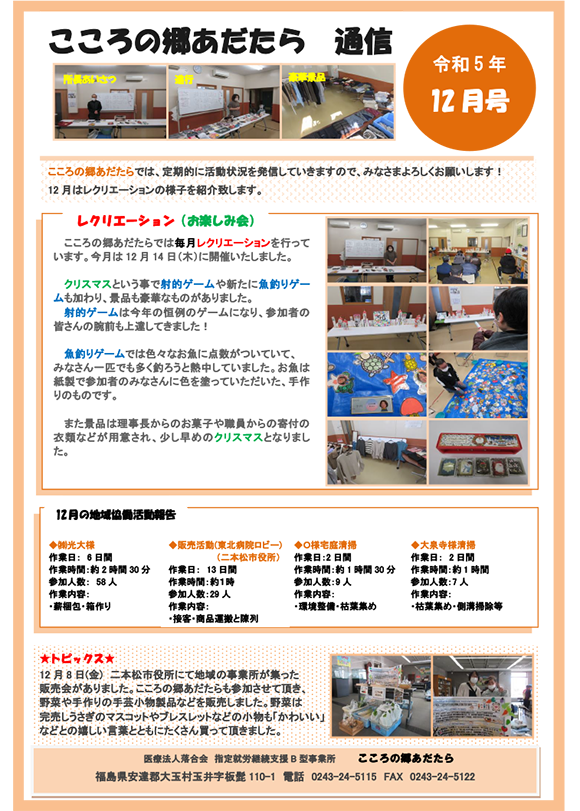 当法人が運営する「指定就労継続支援B型事業所 こころの郷あだたら」の12月活動状況をお知らせします。内容についてお問い合わせ等がありましたら担当者までご連絡ください。