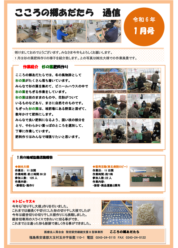 当法人が運営する「指定就労継続支援B型事業所 こころの郷あだたら」の1月活動状況をお知らせします。内容についてお問い合わせ等がありましたら担当者までご連絡ください。