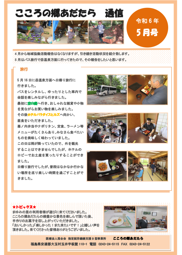 当法人が運営する「指定就労継続支援B型事業所 こころの郷あだたら」の5月活動状況をお知らせします。内容についてお問い合わせ等がありましたら担当者までご連絡ください。