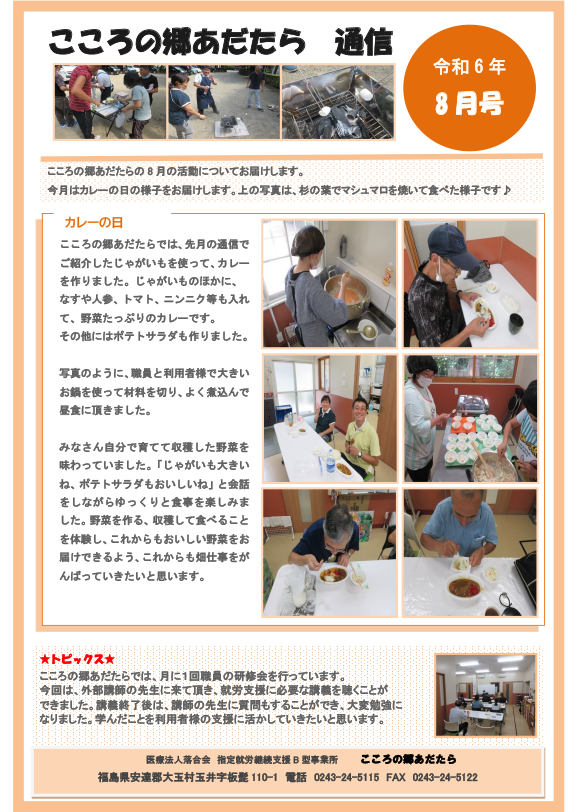 当法人が運営する「指定就労継続支援B型事業所 こころの郷あだたら」の8月活動状況をお知らせします。内容についてお問い合わせ等がありましたら担当者までご連絡ください。