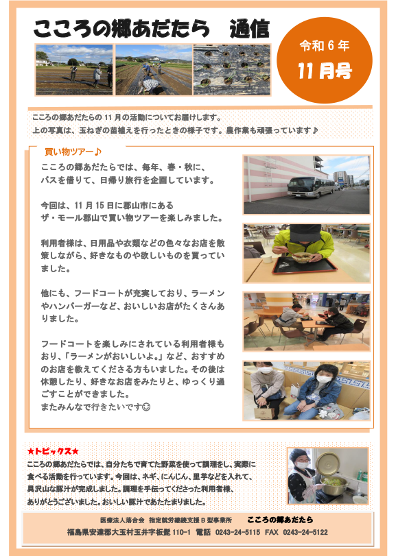 当法人が運営する「指定就労継続支援B型事業所 こころの郷あだたら」の11月活動状況をお知らせします。内容についてお問い合わせ等がありましたら担当者までご連絡ください。