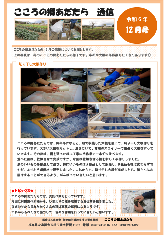 当法人が運営する「指定就労継続支援B型事業所 こころの郷あだたら」の12月活動状況をお知らせします。内容についてお問い合わせ等がありましたら担当者までご連絡ください。